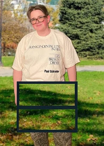 Worse still, the first full-body photo of myself I could find happened to be one showing me modeling a new t-shirt, which replicates the front cover of the original edition of Paul Schrader’s Transcendental Style in Film: Ozu, Bresson, Dreyer. While it’s a great shirt, it draws too much visual attention, implying that this is somehow a “transcendental style” of being part-bookcase, part-man, as opposed to a commercial or otherwise mundane style.
